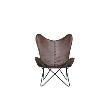 Deze bruine leren vlinderstoel met zwart stalen frame bijvoorbeeld. Ik zag hem juist gisteren in de folder van karwei. Leer wordt overal voor gebruikt.